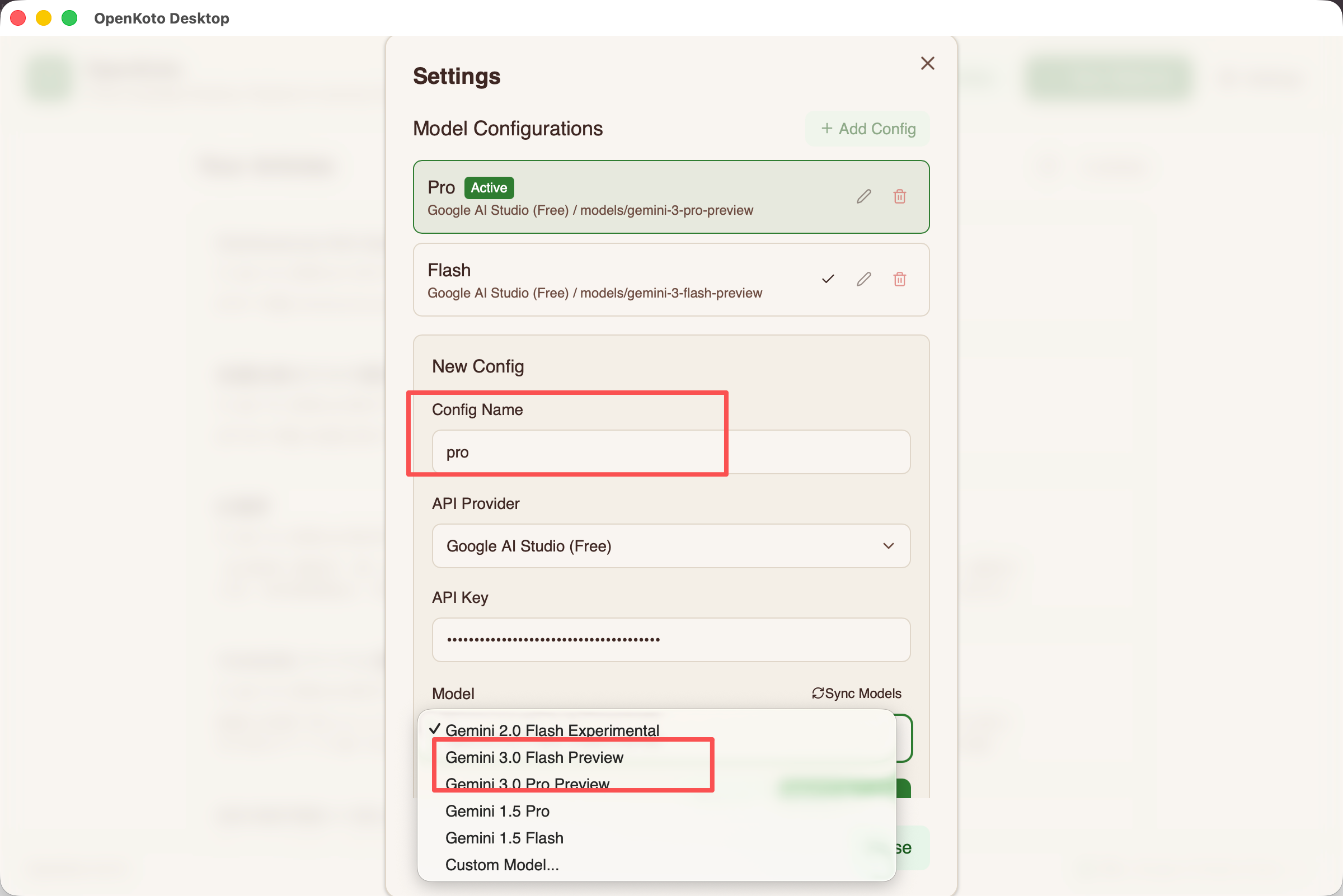 Open OpenKoto, navigate to Settings > Model Provider, and select Google AI Studio. Paste your API key.