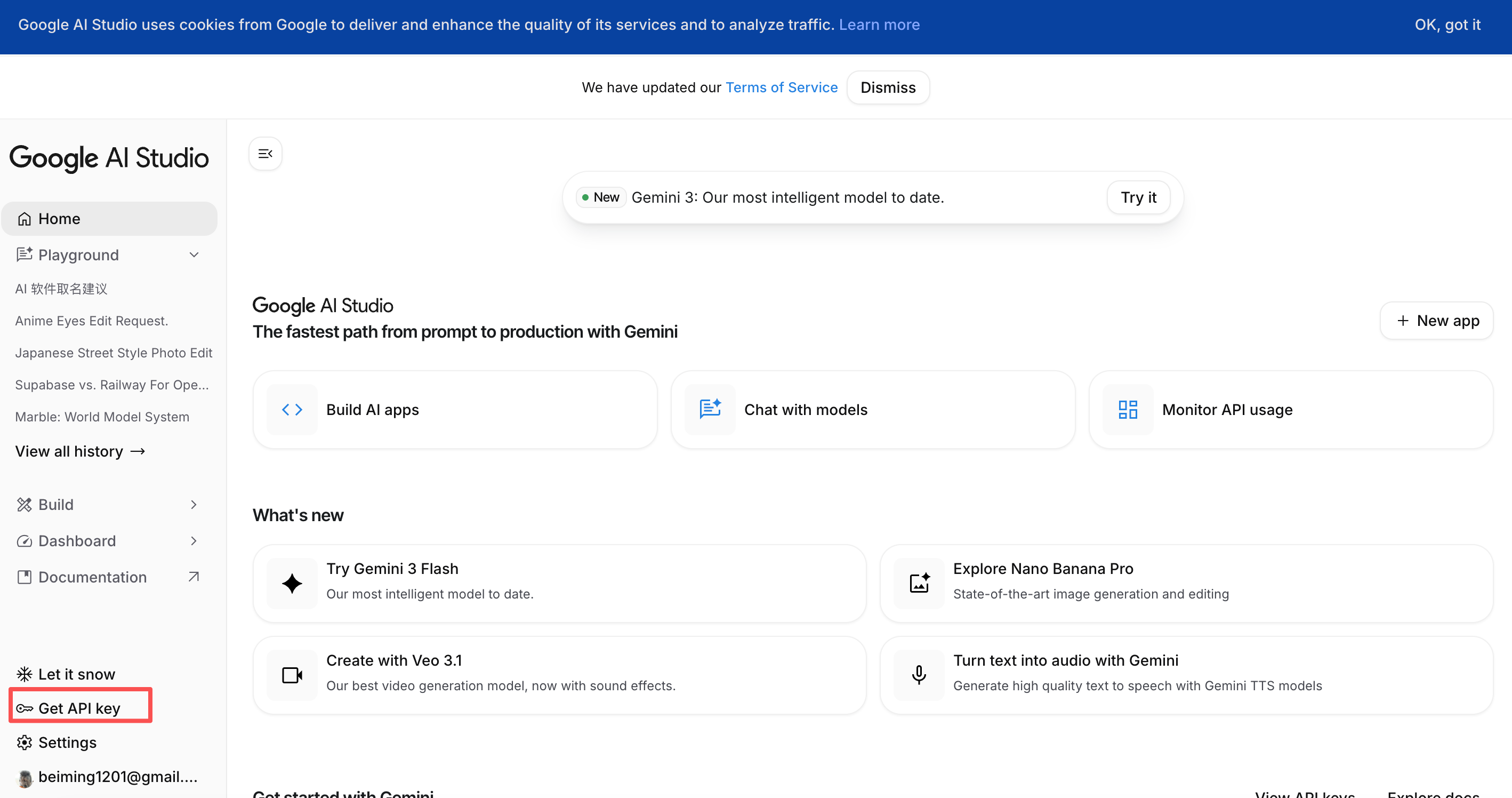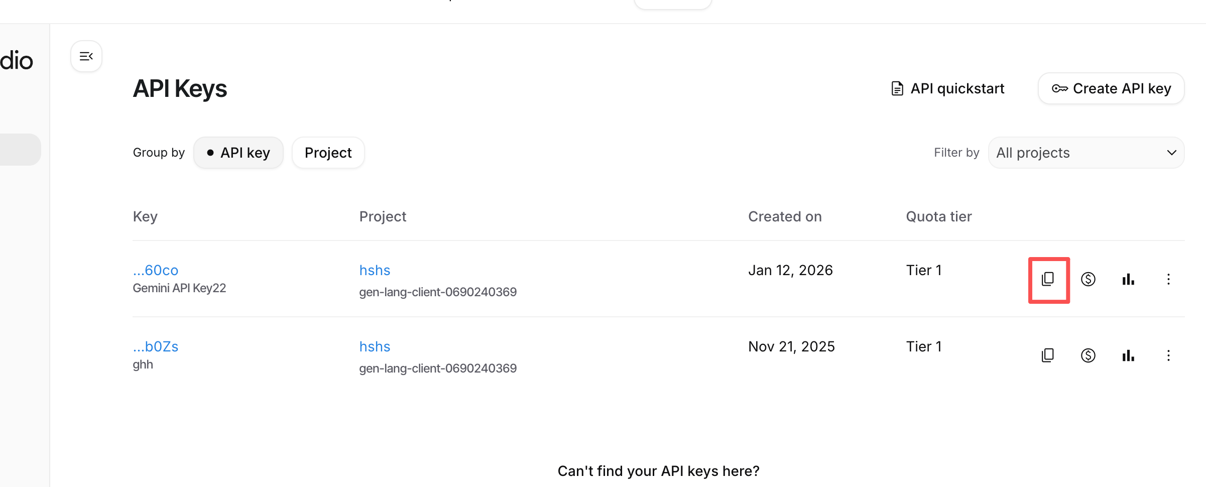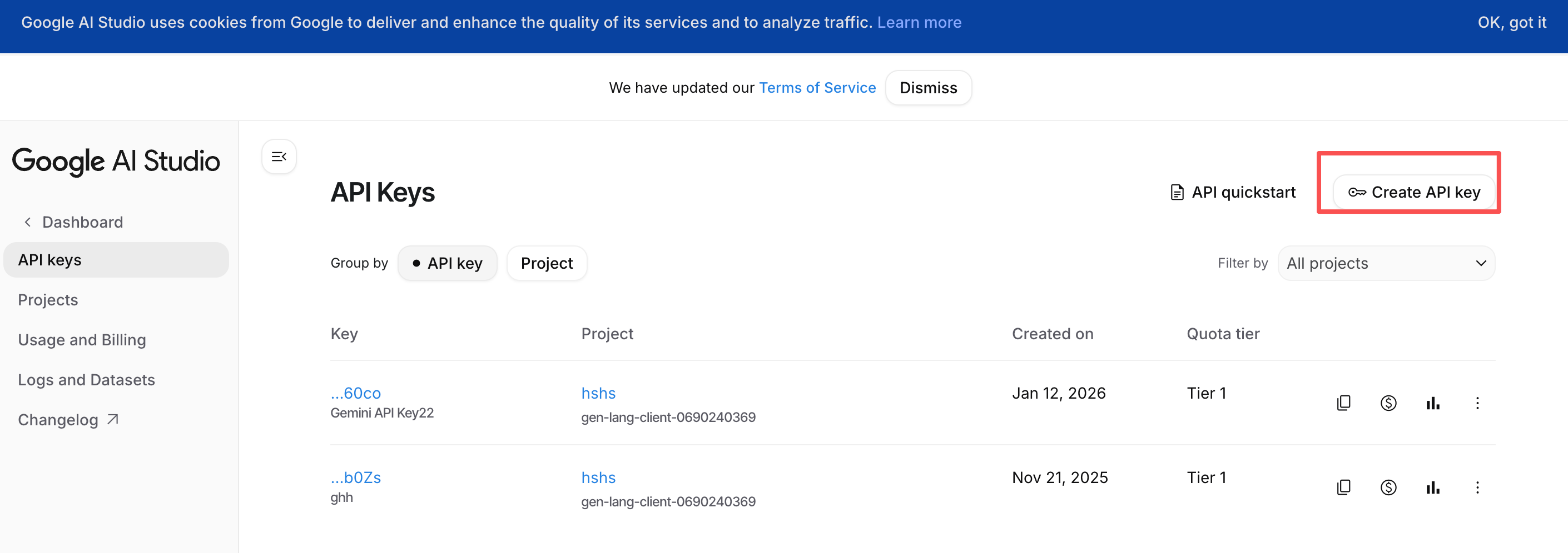 Click on the "Get API key" button on the top left or "Create API key" in the main view.